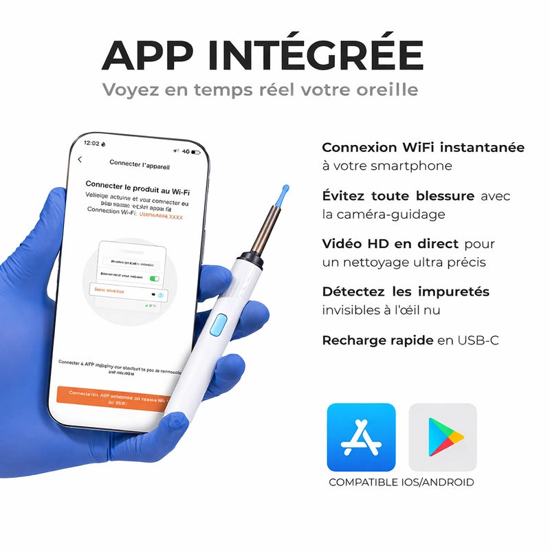 La caméra HD intégrée est une révolution pour l'hygiène auditive. Elle vous offre une vision claire et détaillée du conduit auditif directement sur votre smartphone, permettant un nettoyage avec une précision et une confiance jamais atteintes, sans deviner où vous allez. C'est la fin de l'incertitude.